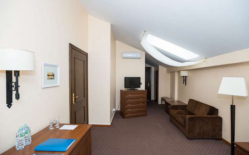 A cozy suite with classical interior. Natural ambient light, as well as the combination of light tones of the walls and dark wood furniture create a great mood for our guests. The suite interior includes all necessary climate control systems and video appliances. The suite is located on the 3rd floor of the hotel.