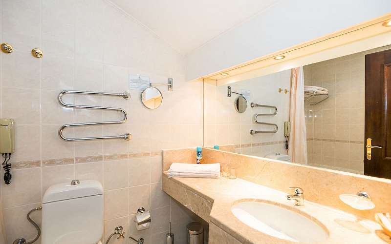 A suite on the third floor of the hotel building. A top choice for a large family with children. A studio consists of two rooms connected by a common door, each with its own bathroom provided. Furniture and interior design, and the room equipment will provide you with necessary comfort.